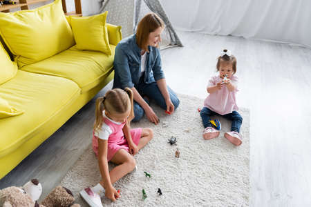 high angle view of kindergarten teacher looking at toddler kid with down syndrome playing with toy near blurred preschooler child in playroom