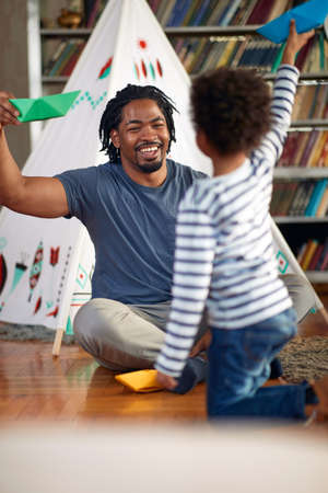 Young father playing with his son in a cheerful atmosphere at home. Family, together, love, playtime