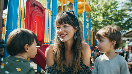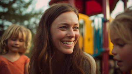 A woman radiates happiness while children play in a cheerful, sunlit playground.