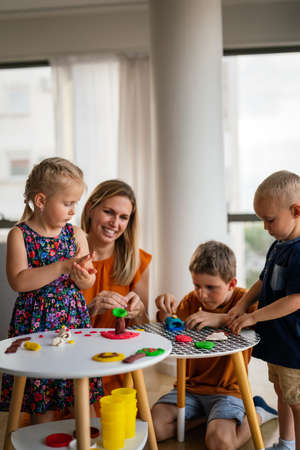 Family, children, education, happiness concept. Mother teaches preschooler kids to do craft items.
