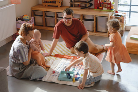 Big family in sunny play room. Parents playing with kids and toys. Happy time together with games. Mother father son daughters at modern colorful home Three cute little children