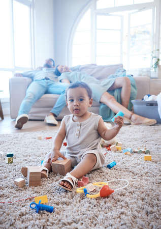 In the blink of an eye. Shot of a little girl playing on the floor while her parents nap in the background.