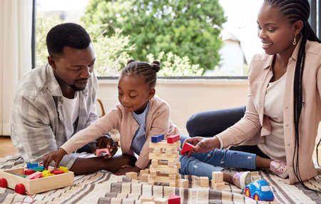 An architect in the making. a little girl playing with blocks with her parents at home.