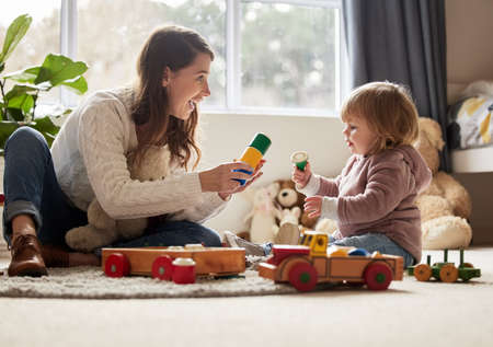 Play is a vital way of learning. Shot of a mother and her little son playing with wooden blocks at home.