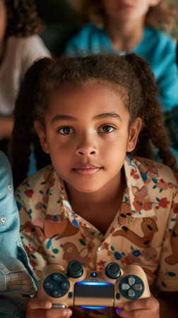 Two Indonesian girls are happily playing video games together in a bright, colorful room.