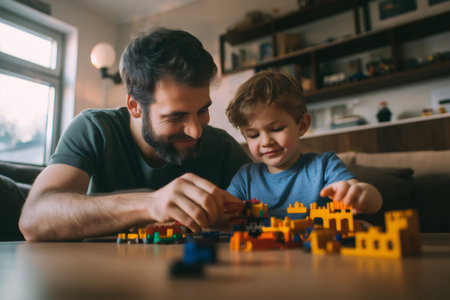 Father and son enjoying their time together building with plastic bricks on a table in the living room