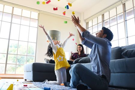Group family of 3 father mother and daughter play game together toss puzzle over head