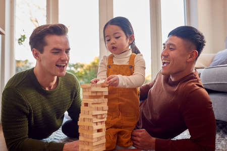 Family With Two Dads Playing Game With Daughter At Home Stacking Wooden Bricks Into Tower
