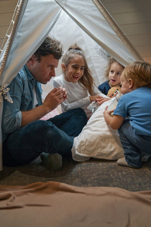 father with many children has fun playing with his small children at home, blowing soap bubbles