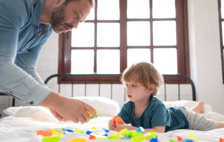Father with little boy have fun playing with your new toys in the bedroom together. Toys that enhance children's thinking skills.