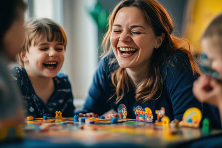 Laughter fills the room as a mother enjoys a board game with her kids, creating cherished family memories.