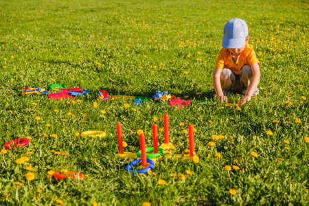 Little child boy playing. Ring throw summer game on a green lawn in the sun made of plastic