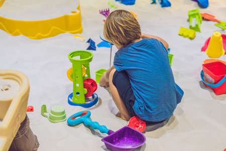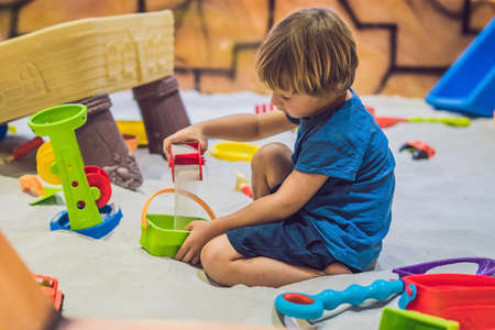 Boy playing with sand in preschool. The development of fine motor concept. Creativity Game concept.