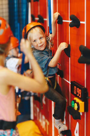 Indoor climbing activities for kids. School b oy smiling at the camera and having fun in indoor playground for children. Happy kids in red helmets climbing the wall in bouldering center