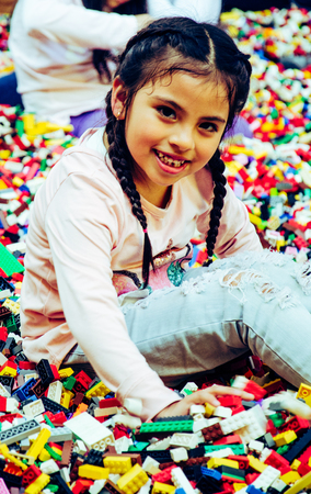 Girl kid play with colorful bricks in kindergarten. Kid day care