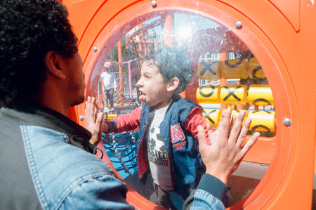 young Latino father and son, happy playing among plastic games in public park in Buenos Aires, child is inside making funny faces at father, they are having fun with each other.