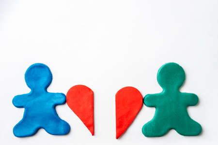 Little men made of blue and green plasticine hold in their hands halves of a red plasticine heart on a white background