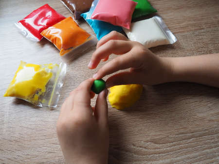 Classes with plasticine. Children's hands crumple soft plasticine. Packages with plasticine are on the table. Creativity for the development of fine motor skills of hands. Creating from plasticine.