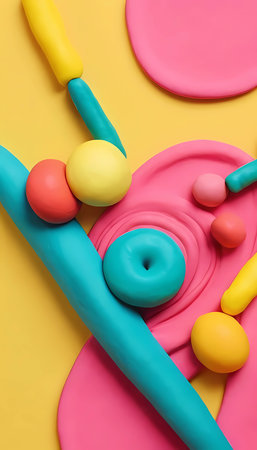 Brightly colored play dough is skillfully shaped into whimsical forms on a vivid yellow background, inviting creativity and fun exploration for all ages.