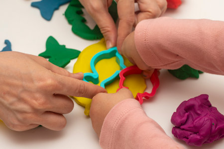 Girl playing dough with her mother. mother and daughter playing on a white background. Making various shapes with dough. close-up. Mother's Day