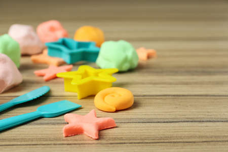 Different color play dough with tools and molds on wooden table, closeup. Space for text