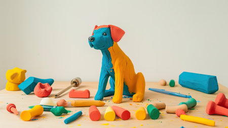 Photo of Photorealistic art of a single, colorful clay figure shaped like a dog, sitting on a light brown table with a variety of modeling clay tools scattered around it. Solid white background. , photorealistic, hyperrealistic --ar 16:9 Job ID: 7bf63e68-7547-4ee4-a5cc-42d5a4fa5f5a