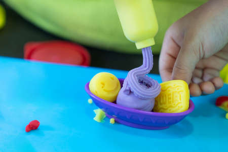 Kid play clay plasticine and playing equipment on wood table, children can use this molding in various dough shapes along imaginative