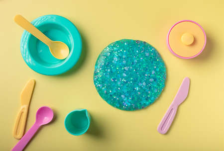 blue glitter slime and kitchen utensil toys