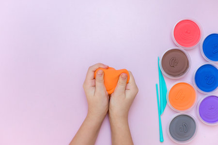 Child hands shaping vibrant clay, playful creative activity with plasticine on white