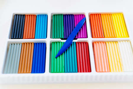 large box with multi-colored plasticine. stationery store for schoolchildren.