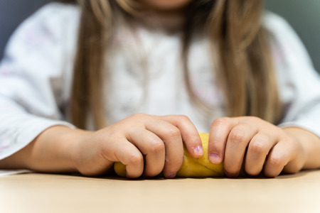 Close view of child's hands playing with homemade play dough. Children's creative game for early development and fine motor skills.