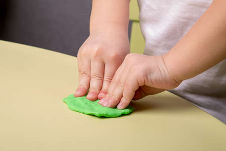 A child crumples a piece of green plasticine on the table, close-up of hands