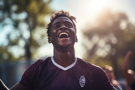 A soccer player jubilantly celebrates scoring a goal, arms raised in the air in excitement, A player celebrating after scoring a goal