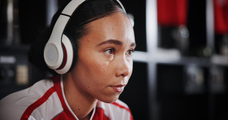 Soccer, locker room and woman with headphones thinking for music, audio or radio for training. Rest, sports and person listen to track for exercise, practice or workout for match, game and tournament