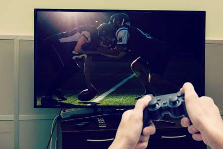 Hand holding game controller playing football game. Man Holding game controller joystick while playing console game.