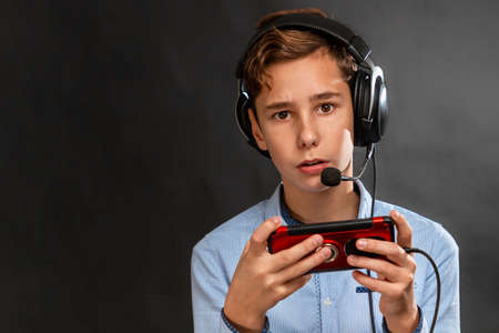 Addiction and dependency concept. Young man with pad joystick playing games. Male addicted to console playstation videogames.