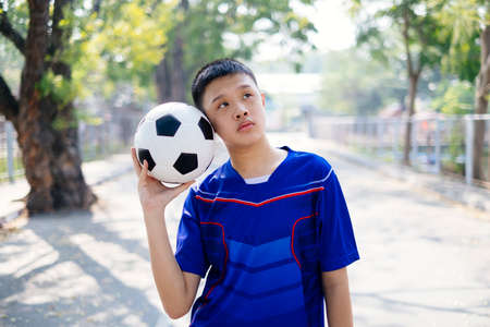 Portrait of a happy young man holding a soccer ball in his hands and smiling