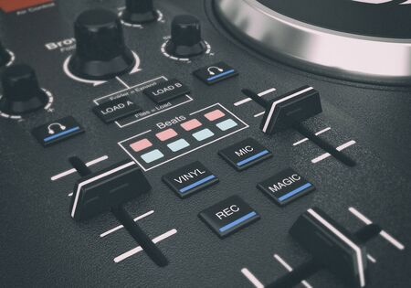 Black Modern DJ Set Turntable Mixer Equipment extreme closeup. 3d Rendering