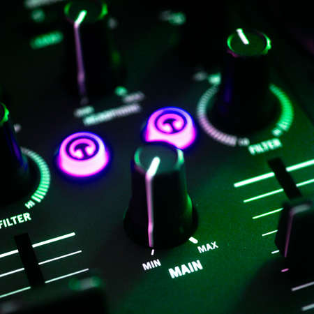 Close-up buttons equipment for sound mixer control. Mixer for musician DJ and sound engineers. Mixing DJ remote with colorful neon light. Night club, nightlife concept