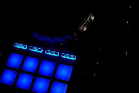 The details of your DJ controller, close. Macro in the dark, with lights. Nightlife