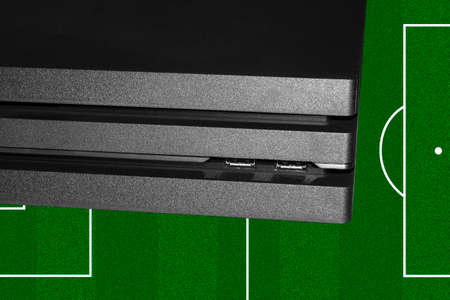 Moscow, Russia - September 11, 2014: Teenager playing football on the Playstation. Playstation game console of the fifth generation, developed by Sony Computer Entertainment Ken Kutaragi-led