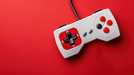 Wired retro gamepad and joystick with wound cable on red background. video game, gaming. top view