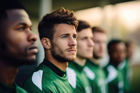 National anthem, football team and listening before competition, game or match. Soccer, song and sports players together with pride, group collaboration and serious for contest, exercise or workout
