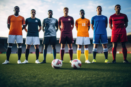 A diverse group of individuals in colorful uniforms standing together on a vibrant green field, A group of players in colorful uniforms on a grassy field