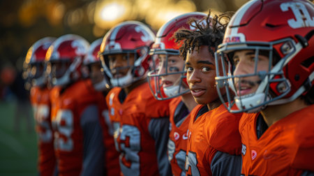 Portrait of young american football players standing in line at stadium