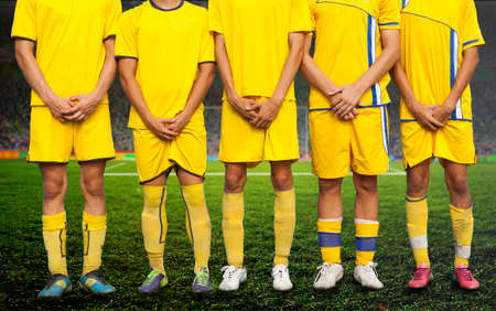 Rear view of soccer players standing together on pitch and looking away