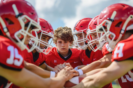 Team huddle after a winning goal, ecstatic, unity, triumphant