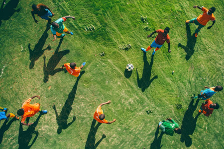 Players are playing a soccer match, aerial shot with a drone from a altitude at summer day.