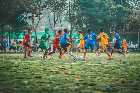 Group of young men in colorful uniforms playing a game of soccer on a grassy field, A group of players in colorful uniforms on a grassy field