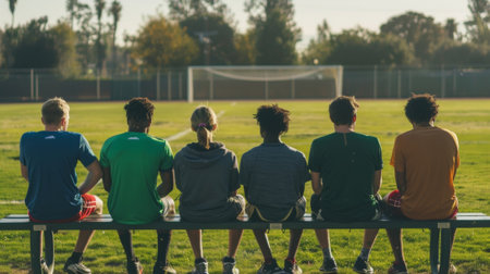 A group of athletes sit on a bench facing away from the camera and gazing out at the green field in front of them. relaxed postures .